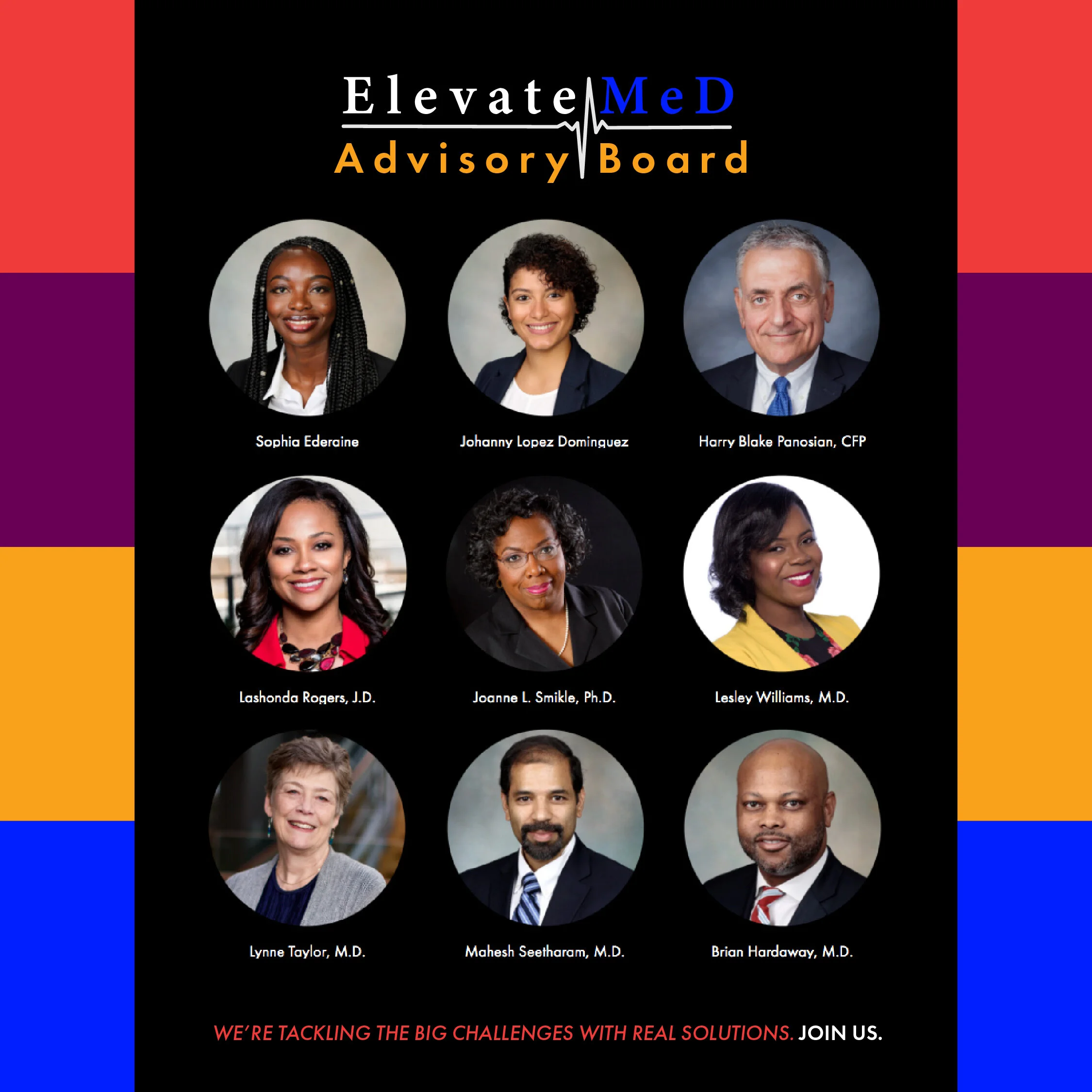 Over the past 12 months, we have identified individuals who are committed to the mission and vision of ElevateMeD and desire to see our programmatic and philanthropic goals manifest. We recognized that in order to build programs that will be of value to medical students, we needed to have medical student advisors. In addition to our students, we have several physicians with a variety of backgrounds from private practice to academic medicine. Our physician advisors bring the expertise of being authors, patient advocates, mentors, and leaders of medical societies. From experts in law, executive development and leadership education to financial planning and wealth management, our board of advisors is engaged and already contributing to our growth and success.