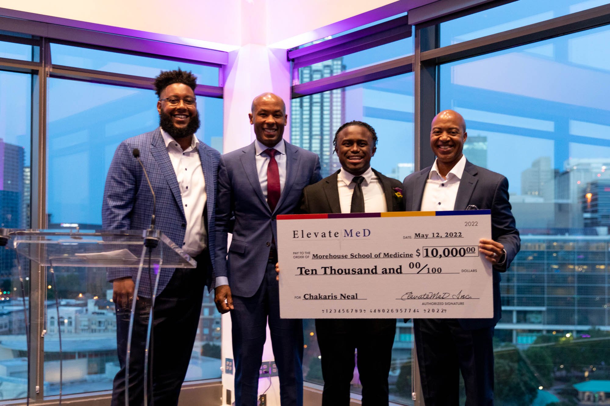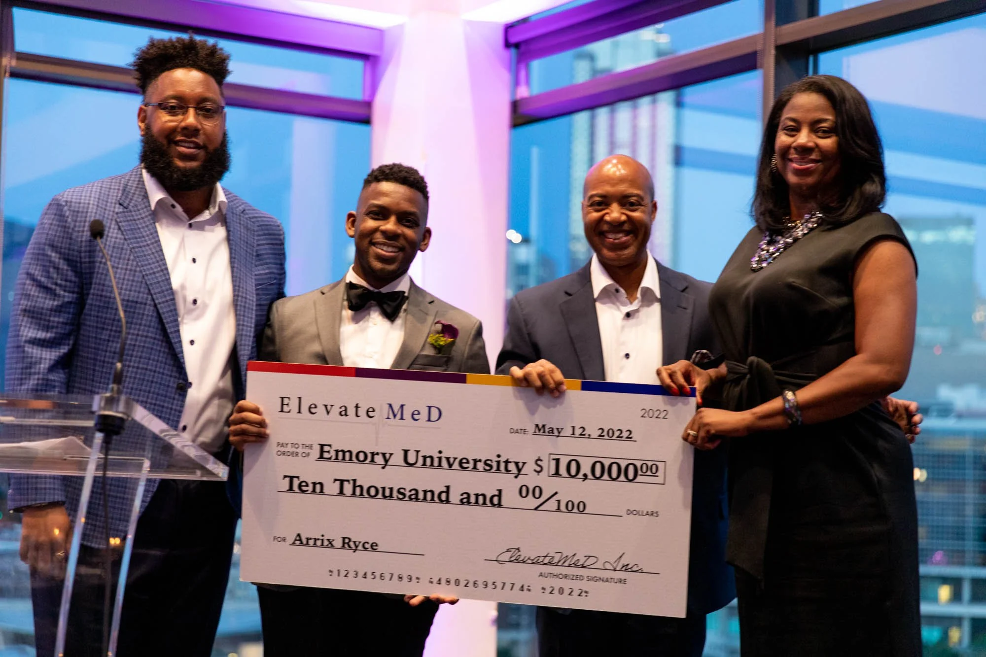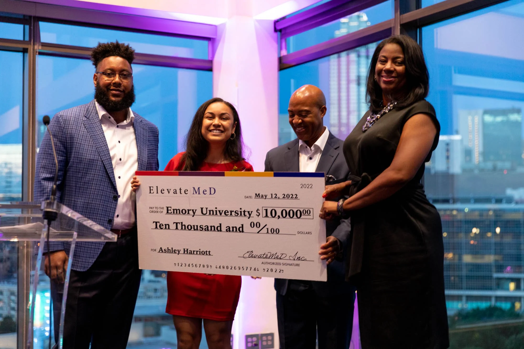 Ashley Harriot (Emory ‘24), Arryx Rice (Emory ‘23), and Chakaris Neal (Morehouse ‘23) were each presented with a $10,000 check for their tuition based scholarships, presented by ElevateMeD Treasurer Patrick Brooks and ElevateMeD Co-Founder Dr. Gregory Umphrey